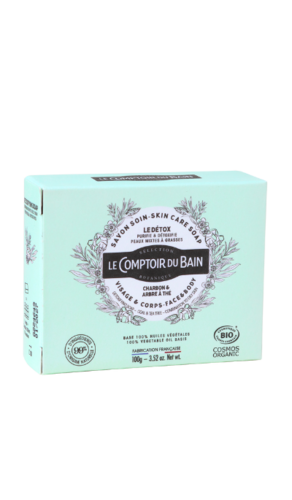 Composé de 99% d’ingrédients d’origine naturelle et sans huile de palme, ce soin nettoie en profondeur le visage et le corps tout en respectant la peau. Ses actifs, charbon et arbre à thé biologiques, régulent l’excès de sébum, favorisent la diminution des imperfections, et apaisent durablement. Jour après jour, la peau est plus nette, lisse et lumineuse. Parfum frais et vivifiant. 1 savon 100g ≈ 3 bouteilles de gels douche 200ml, 75 lavages.